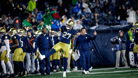 Notre Dame hit the field for practice No. 4 on Wednesday and it was Kedren Young’s turn to have his playlist playing during stretching. ISD was present for the first four periods.